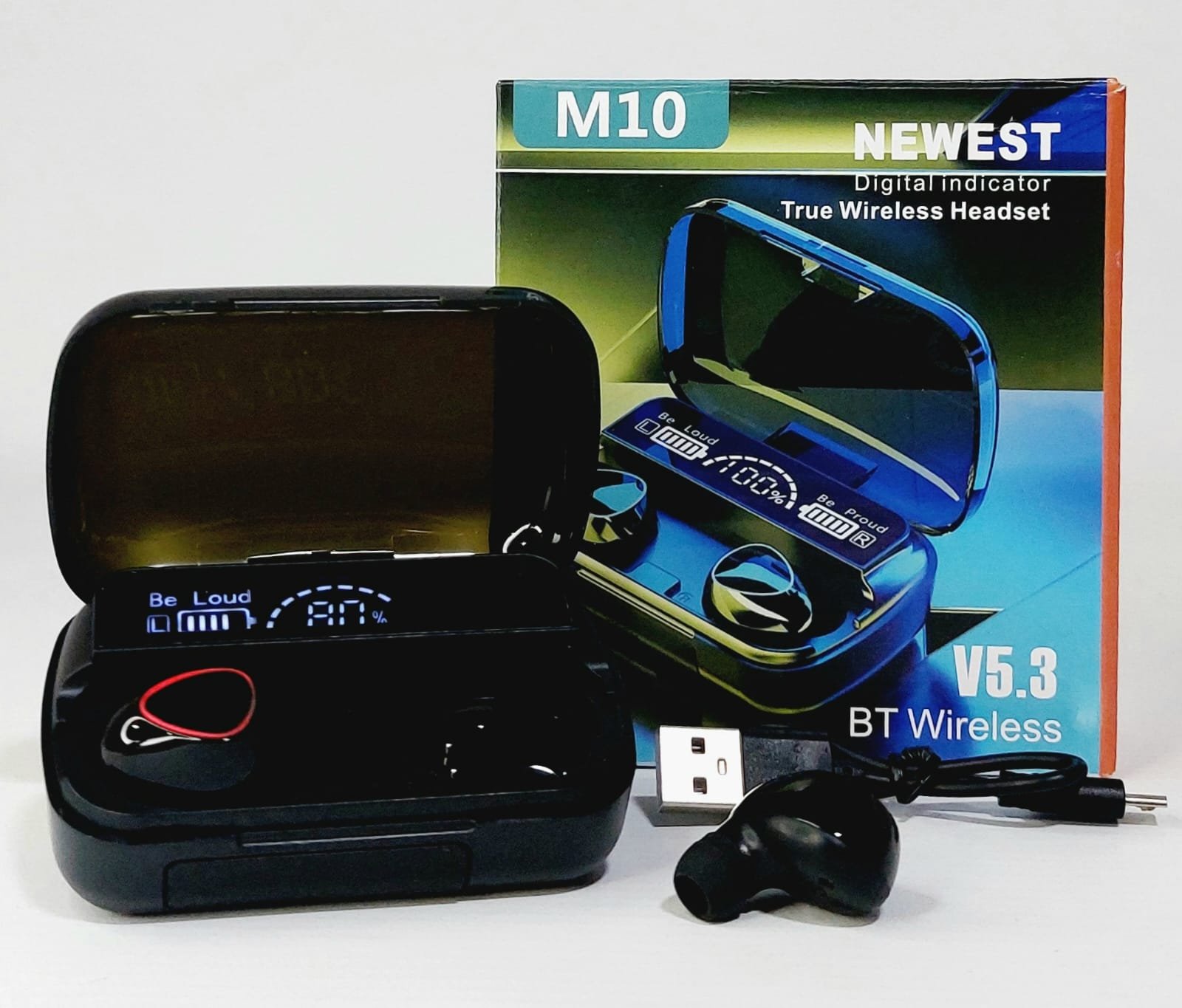 Auriculares inalámbricos M10 con estuche de carga y pantalla LED que muestra el nivel de batería. Brindan sonido claro, conexión estable Bluetooth y diseño ergonómico para un uso cómodo durante todo el día. Ideales para escuchar música, atender llamadas y disfrutar de una experiencia práctica y portátil.