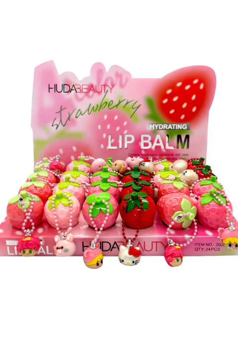 Balsamo Labial Frutilla Personajes Huda Beauty práctico, atractivo y perfecto para uso diario.