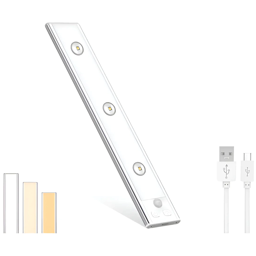 Entre sus características y puntos más relevantes se destacan: Características del Producto; Iluminación Ajustable: El gráfico en la esquina inferior izquierda indica que ofrece tres temperaturas de color: blanco frío, blanco neutro y blanco cálido; Sensor de Movimiento: Incluye un sensor infrarrojo (el pequeño domo circular) que permite el encendido automático al detectar presencia, optimizando el ahorro de energía.; Recargable por USB: Viene con un cable de carga, lo que elimina la necesidad de baterías desechables.; Instalación Magnética: Incluye dos pequeñas placas metálicas adhesivas que permiten montar y desmontar la lámpara fácilmente para recargarla..