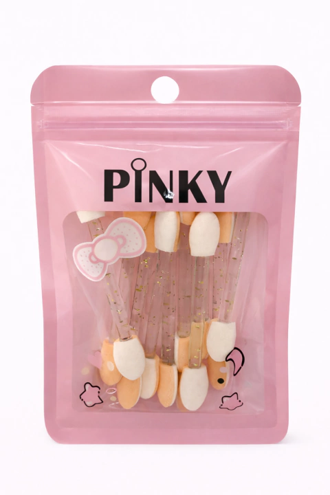 El set de pincelitos aplicadores dobles Pinky incluye 10 unidades ideales para lograr una aplicación precisa de maquillaje. Su diseño con doble punta permite trabajar diferentes zonas, facilitando la aplicación de sombras, labiales o detalles finos.