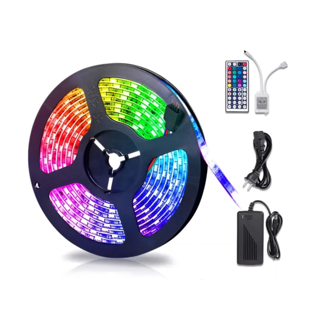 Entre sus características y puntos más relevantes se destacan: Componentes del Kit; Carrete de Tira LED: Una cinta flexible con diodos LED integrados que emiten luz en colores Rojo, Verde y Azul (RGB), permitiendo crear millones de combinaciones cromáticas.; Control Remoto IR: Incluye un mando para cambiar colores, ajustar el brillo y seleccionar modos de iluminación (parpadeo, desvanecimiento, fijo).; Caja Receptora/Controlador: El pequeño dispositivo blanco que recibe la señal del control remoto y gestiona la energía hacia la tira.; Adaptador de Corriente: Transforma el voltaje doméstico para alimentar los LEDs de forma segura..