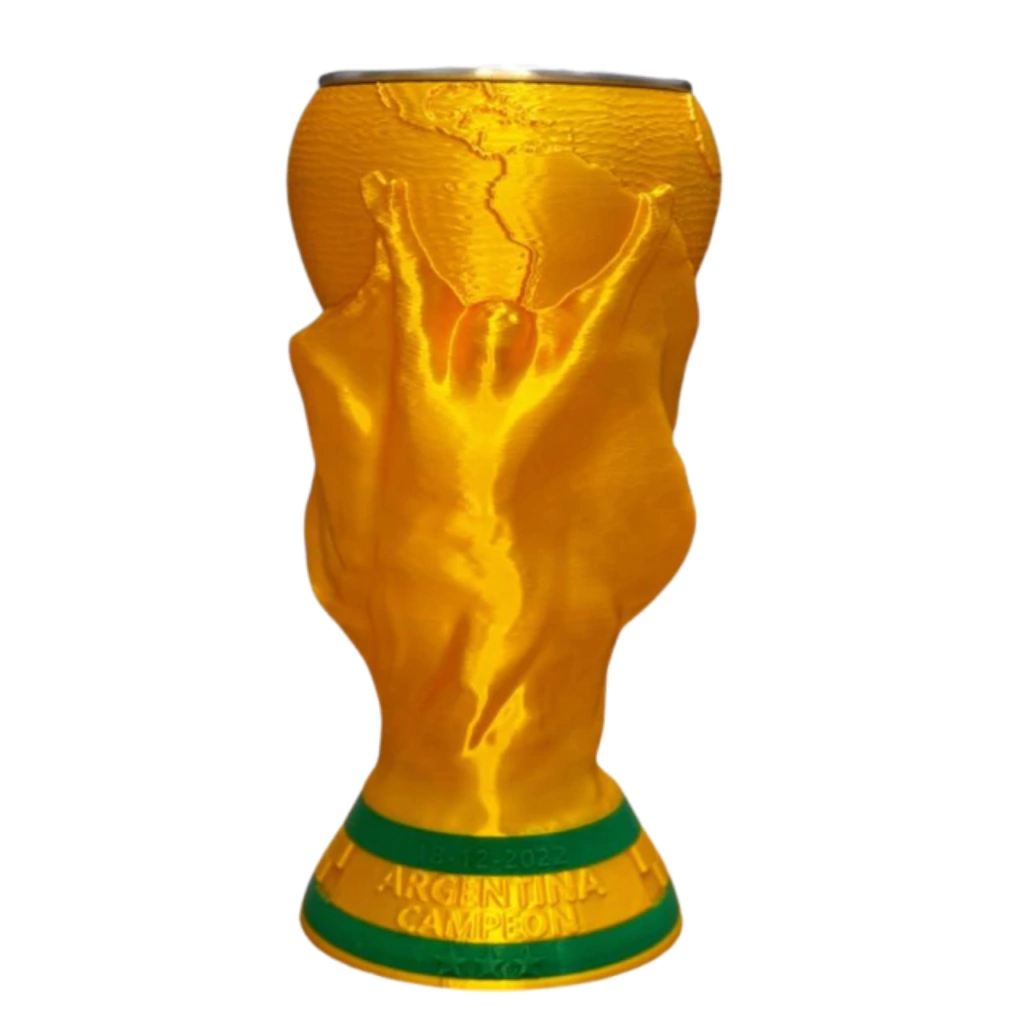 Entre sus características y puntos más relevantes se destacan: Características del producto:; Diseño: Es una réplica impresa en 3D del trofeo original, que incluye detalles personalizados en la base como la inscripción “18-12-2022 ARGENTINA CAMPEÓN” y las tres estrellas que representan los títulos mundiales del país.; Funcionalidad: Está diseñado para albergar en su interior un vaso de aluminio, lo que lo hace ideal para compartir bebidas como el fernet..